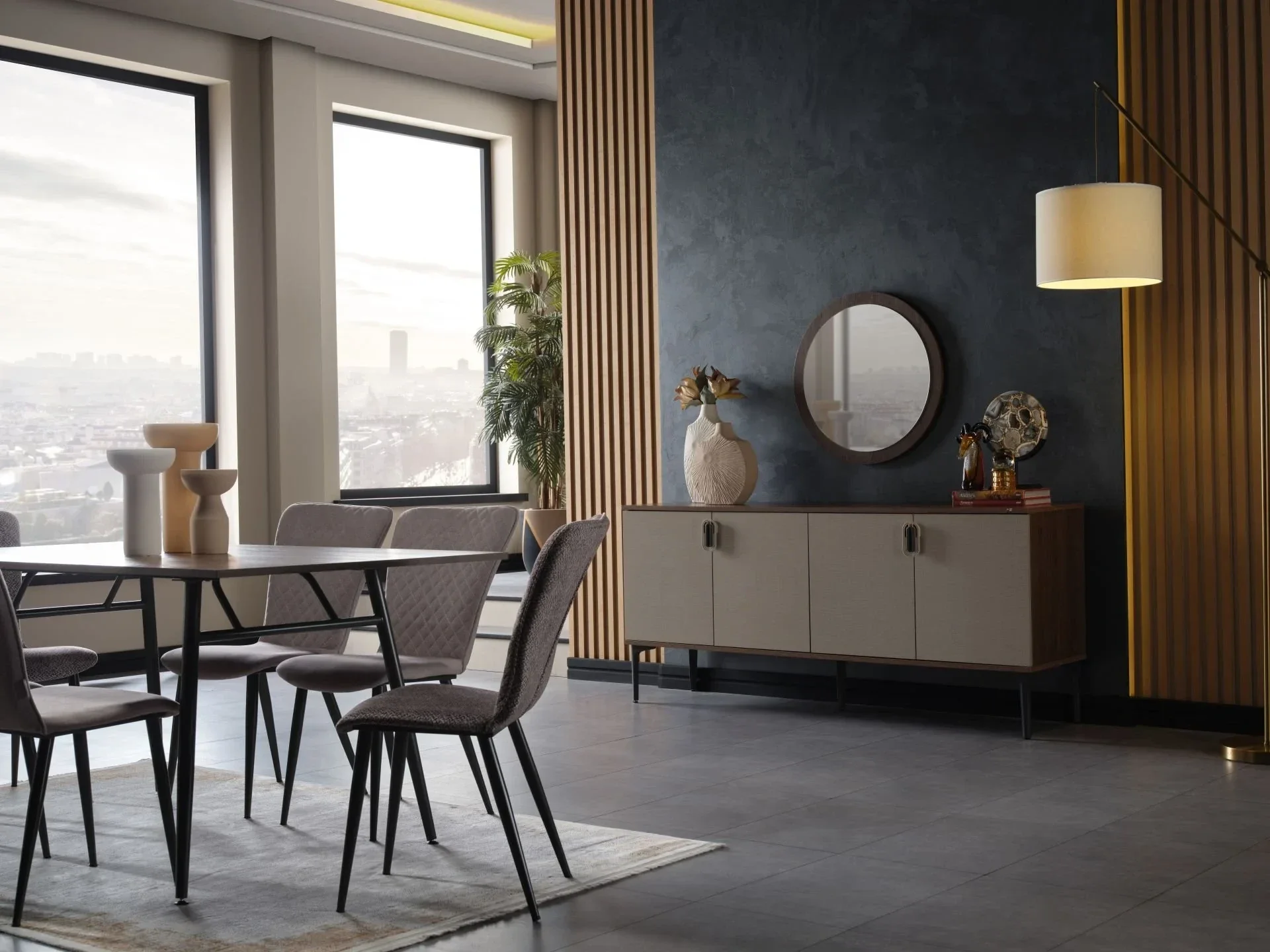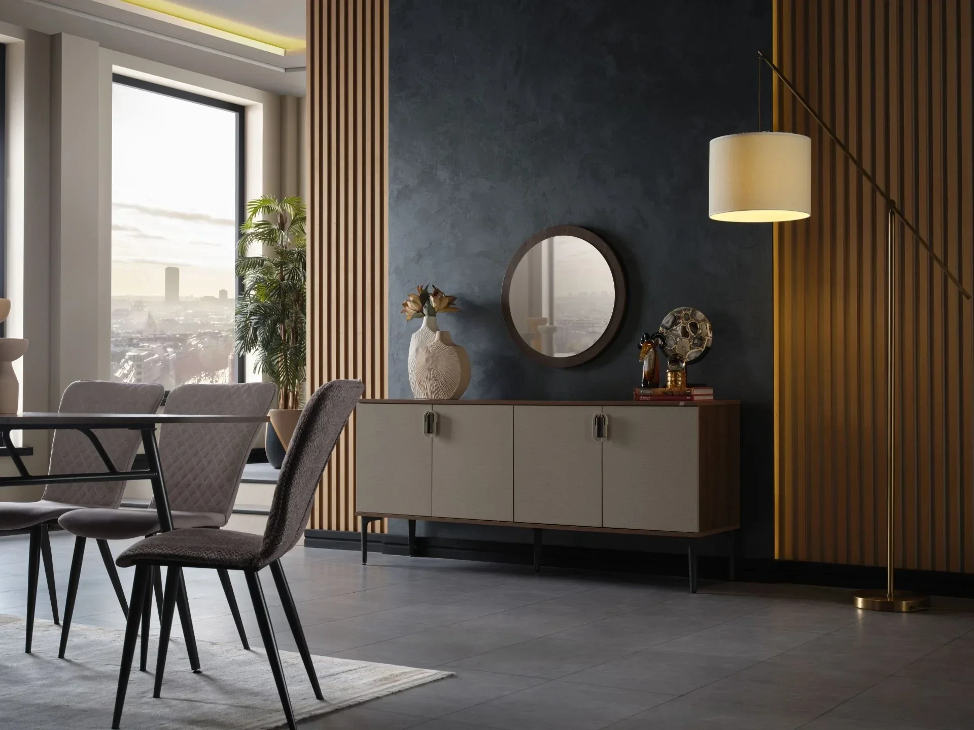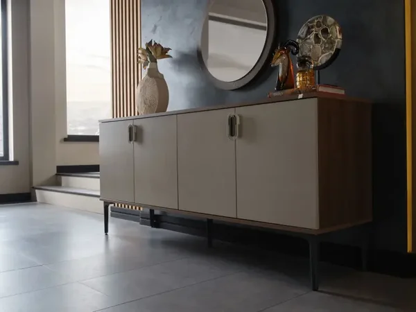 Buffet avec miroir : Offre un espace de rangement supplémentaire tout en ajoutant de la profondeur à la pièce.