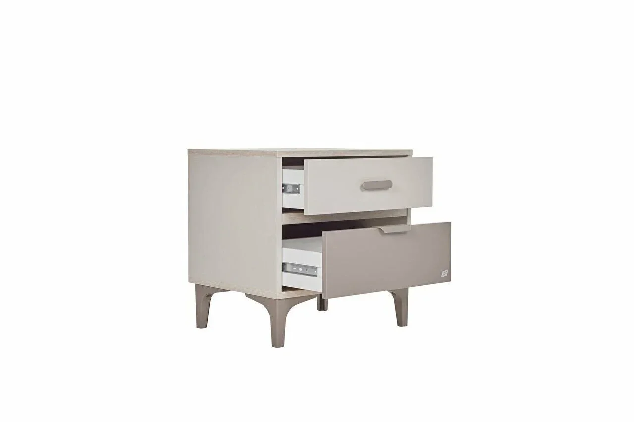Le Hera Komodin // Chevetest un meuble de rangement élégant et fonctionnel, conçu pour les chambres d'adolescents. Il se distingue par son design moderne et sa combinaison harmonieuse de couleurs claires et de tons gris, apportant une touche de fraîcheur et de modernité à l'espace.