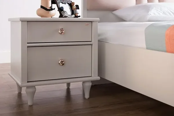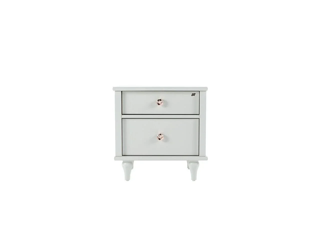 Le Emily Komodin // Chevet est un meuble de rangement élégant et fonctionnel, conçu pour les chambres d'adolescents. Il se distingue par son design moderne et sa combinaison harmonieuse de couleurs claires et de tons gris, apportant une touche de fraîcheur et de modernité à l'espace.
