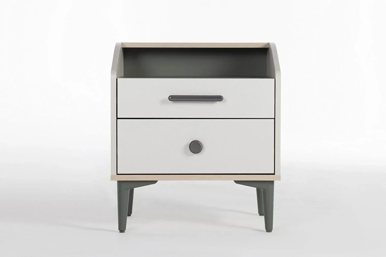 Le LEO Komodin // Chevet est un meuble de rangement élégant et fonctionnel, conçu pour les chambres d'adolescents. Il se distingue par son design moderne et sa combinaison harmonieuse de couleurs claires et de tons gris, apportant une touche de fraîcheur et de modernité à l'espace.